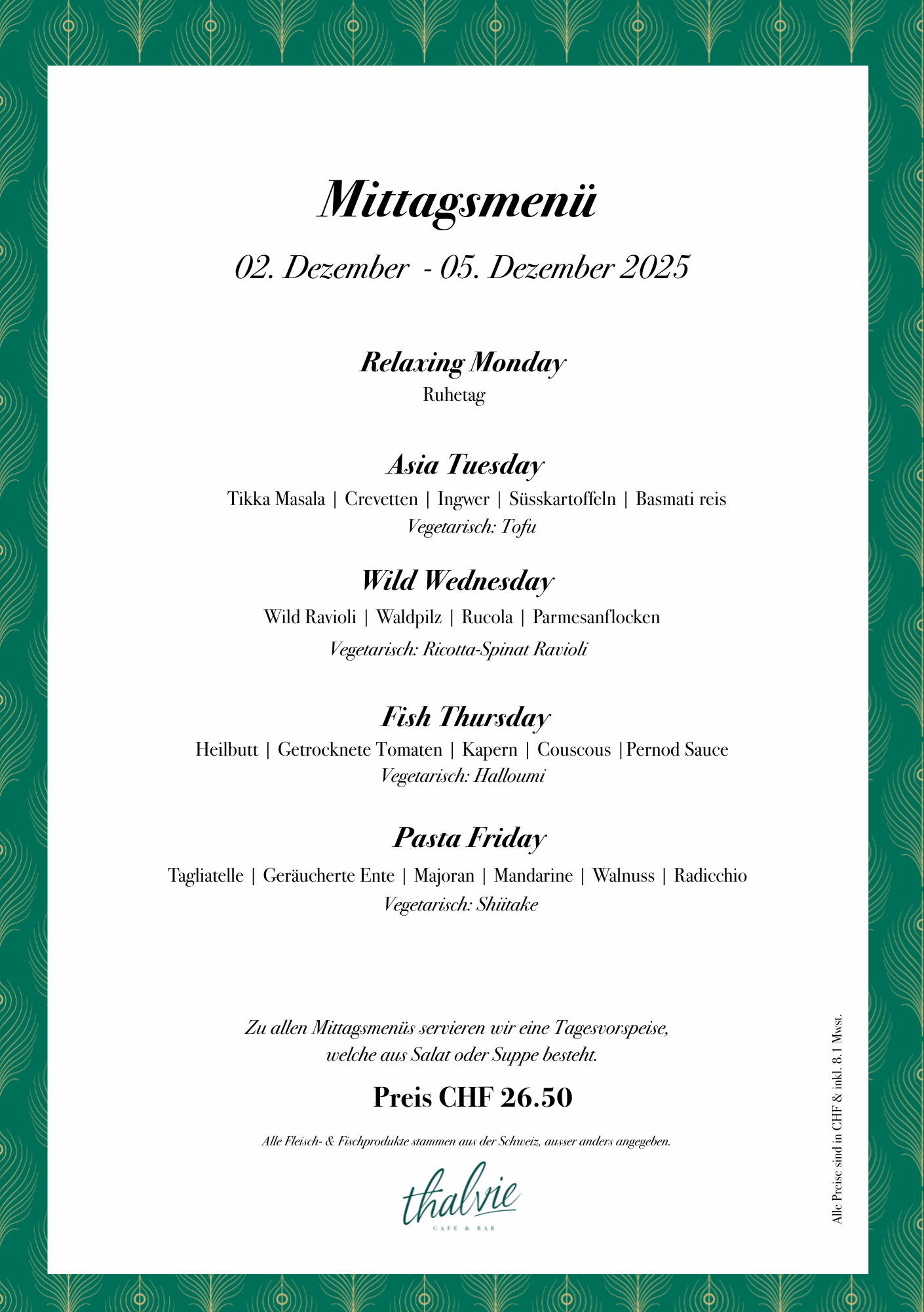Geniesse unser wöchentlich wechselndes Lunch-Menü. Reserviere dir gerne einen Tisch oder komme spontan vorbei und geniesse ein einmaliges Geschmackserlebnis mit frischen Zutaten.